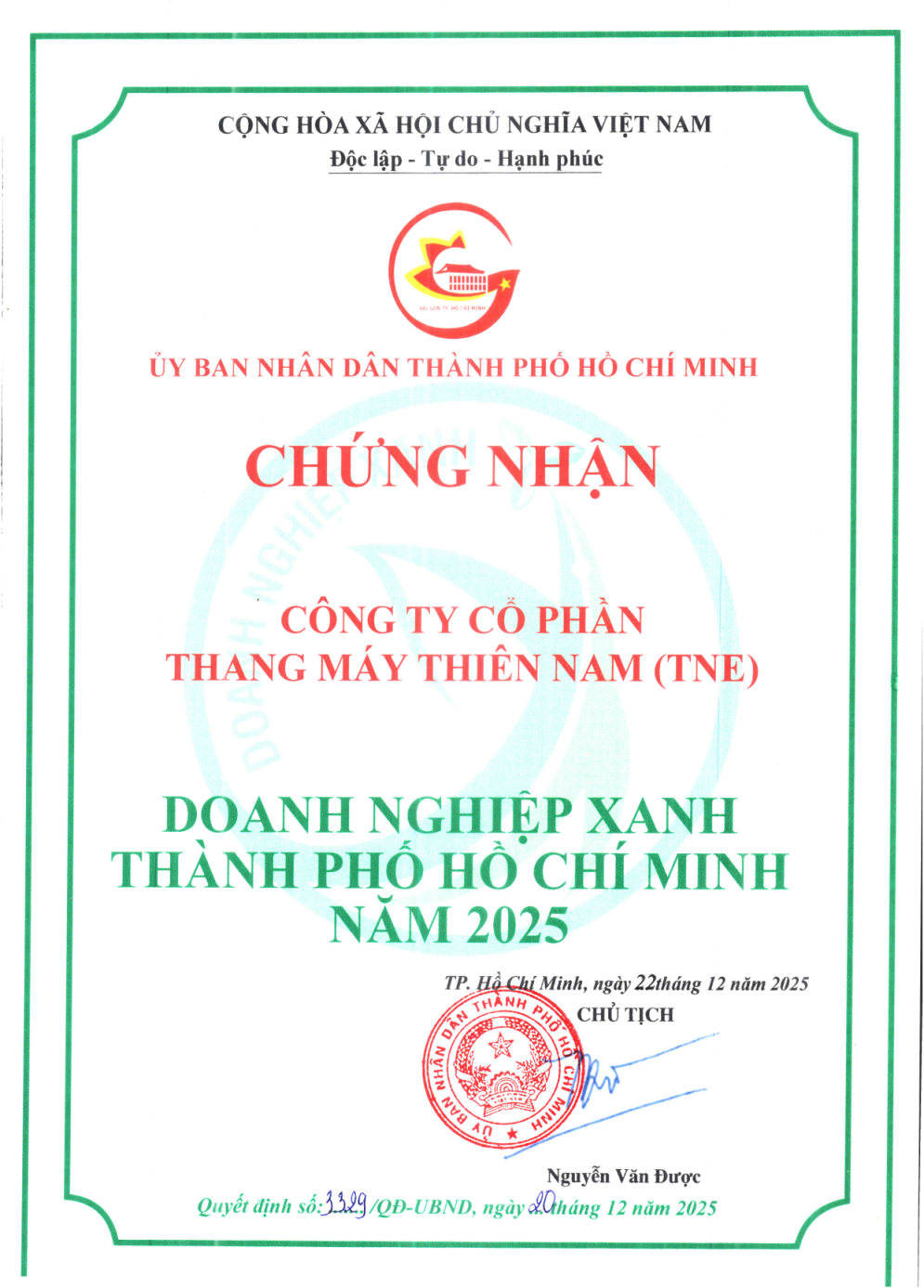 Thang máy Thiên Nam cam kết thiết lập, thực hiện và cải tiến thường xuyên hệ thống Quản lý chất lượng ISO9001: 2015 cho hoạt động sản xuất và dịch vụ hậu mãi.